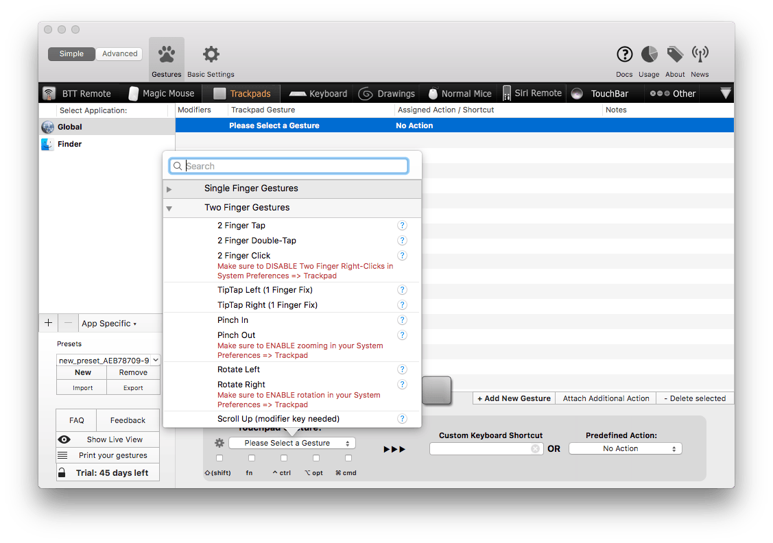 Klik op Trackpads / Add New Gesture en klik op Please Select a Gesture. Kies voor bijvoorbeeld Two Finger Gestures en selecteer één van de bewegingen uit de lijst. Als je niet precies weet wat bijvoorbeeld een Tip Tap Left is, dan klik je op het vraagteken voor meer informatie. Onderin wordt de Gesture overigens via een gifje weergegeven.