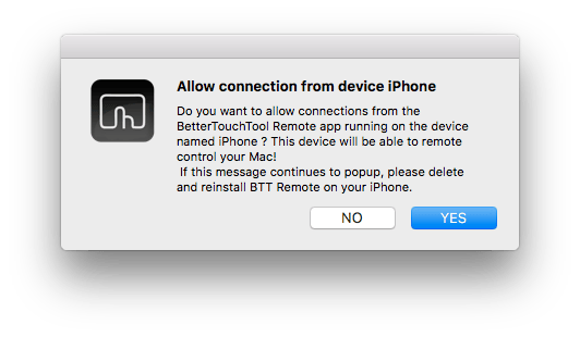 Tik op je iPhone op Save en vervolgens op het Mac-icoontje in de app. Op je Mac krijg je een melding of je wilt dat BTT Remote verbinding mag maken. Klik op Yes en beide apps zijn met elkaar verbonden. Je moet nu acties toevoegen op je Mac via de knop Add Remote Trigger.