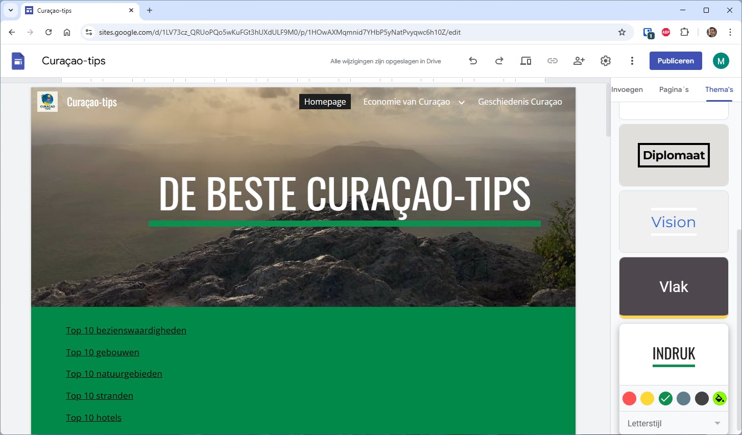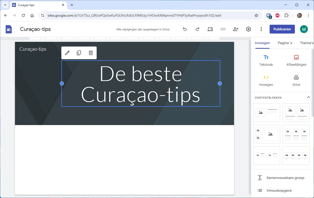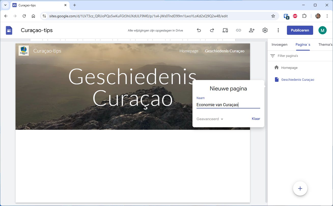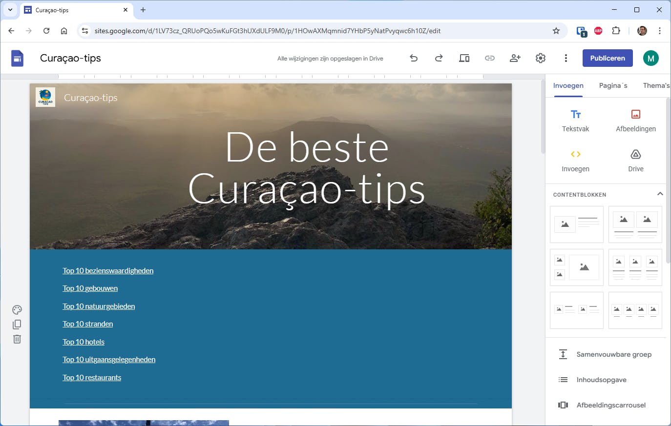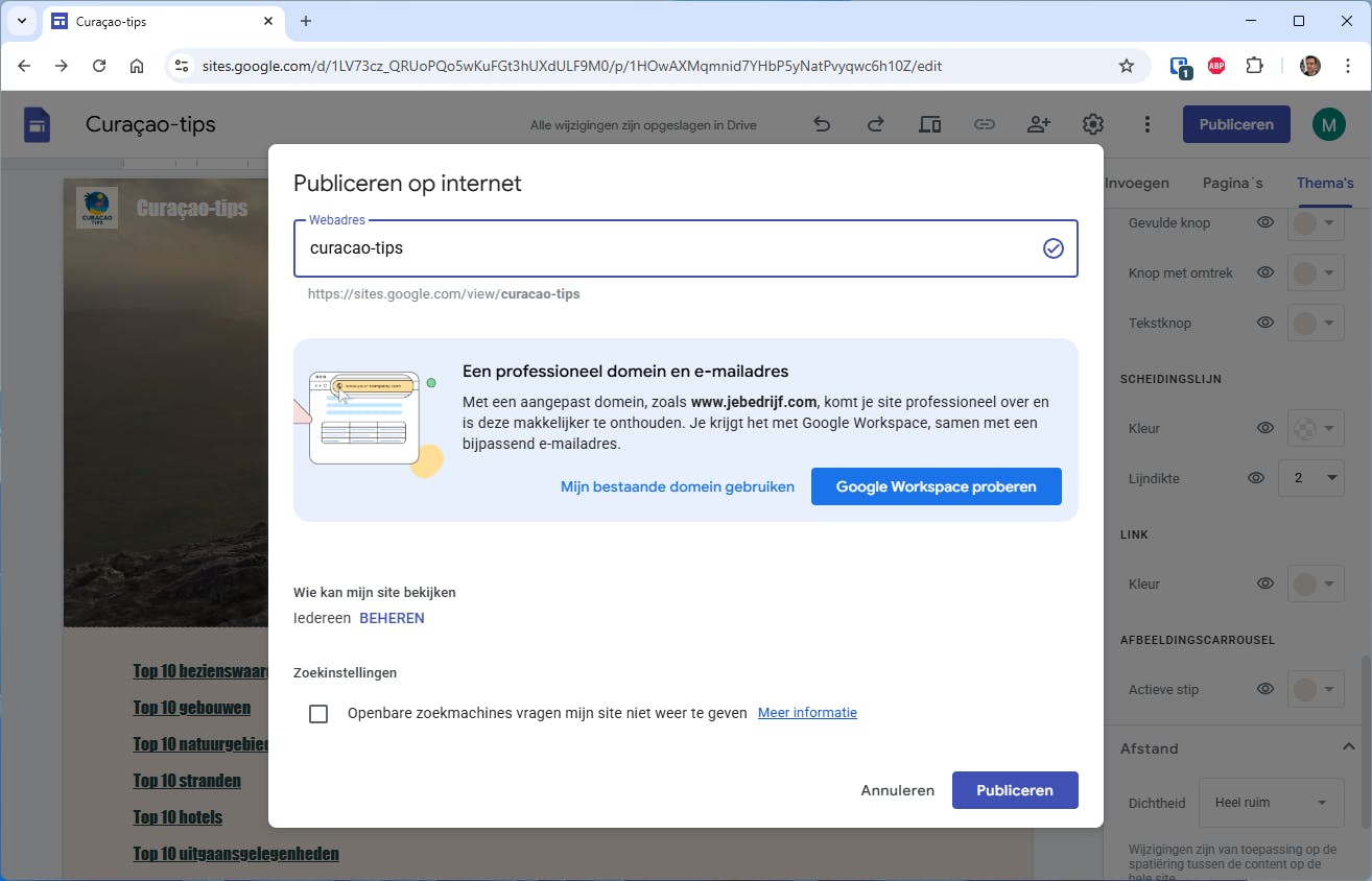 Ben je helemaal tevreden over jouw website? Hoog tijd om het openbaar te maken! Klik rechtsboven op de blauwe knop Publiceren. Het (gratis) domein begint altijd met https://sites.google.com/view/. Het einde van deze url kun je zelf verzinnen. In ons voorbeeld is de volledige link https://sites.google.com/view/curacao-tips.
