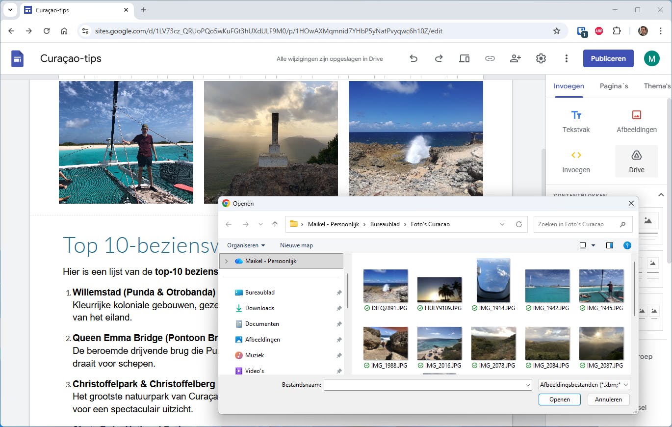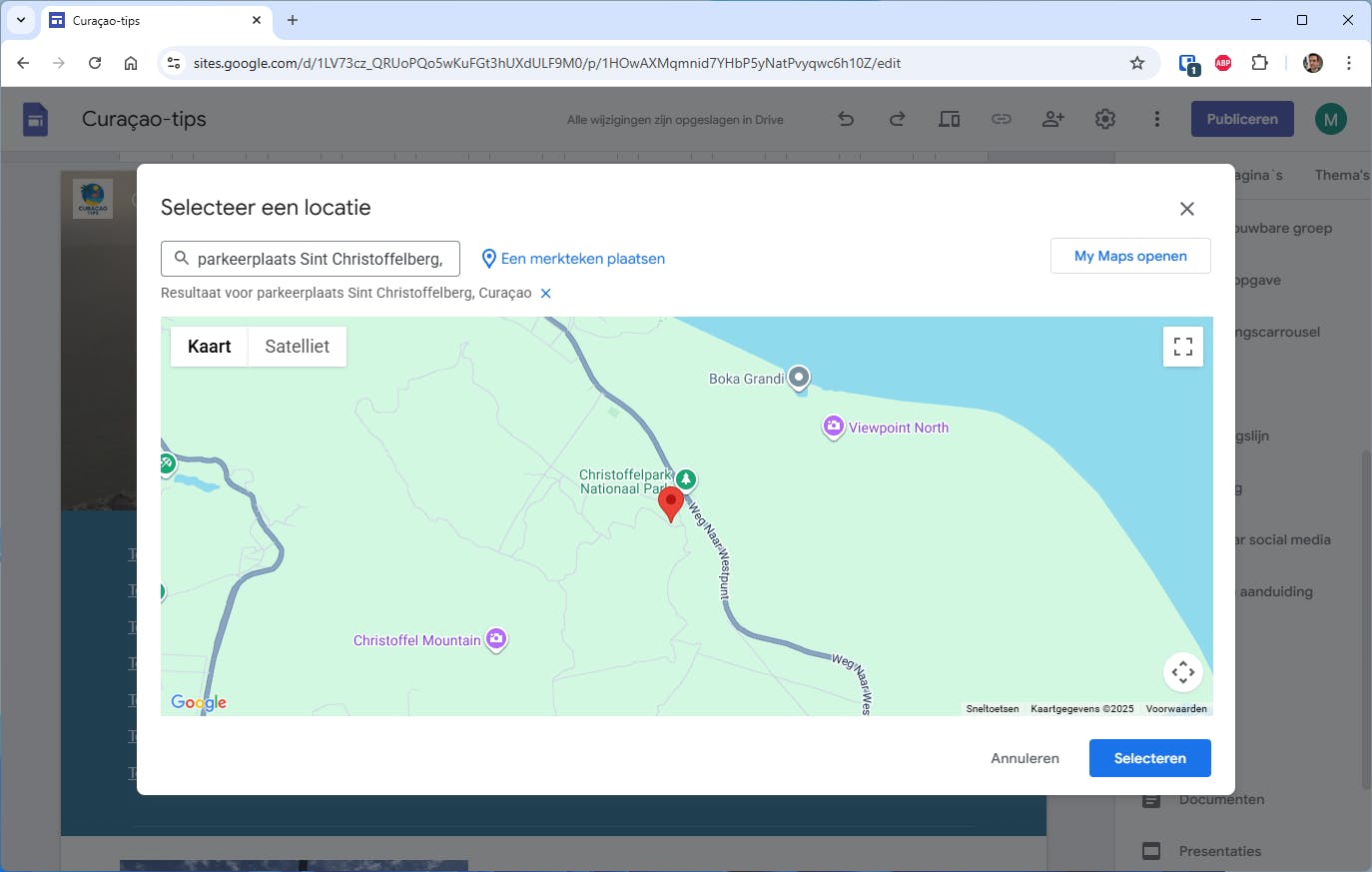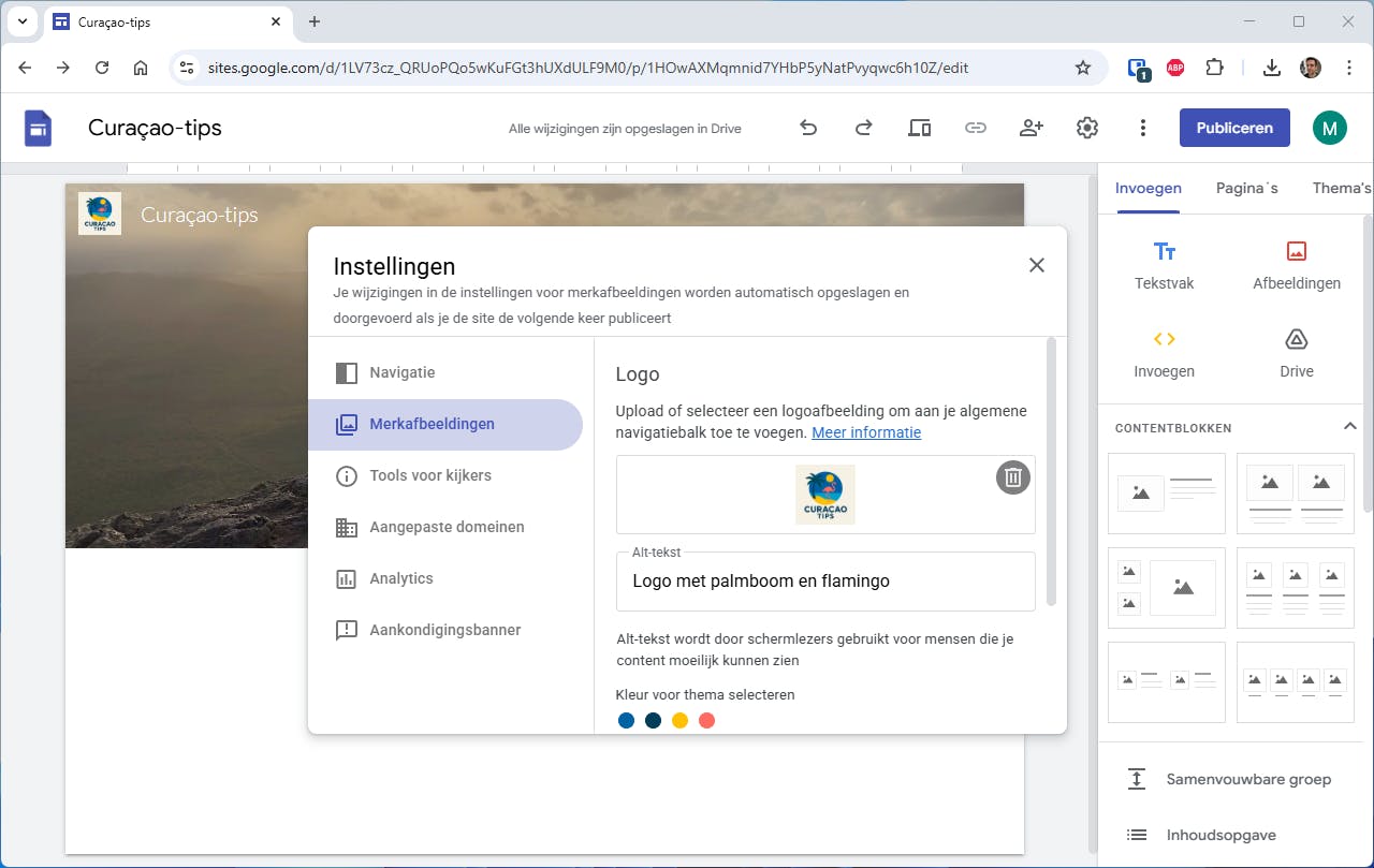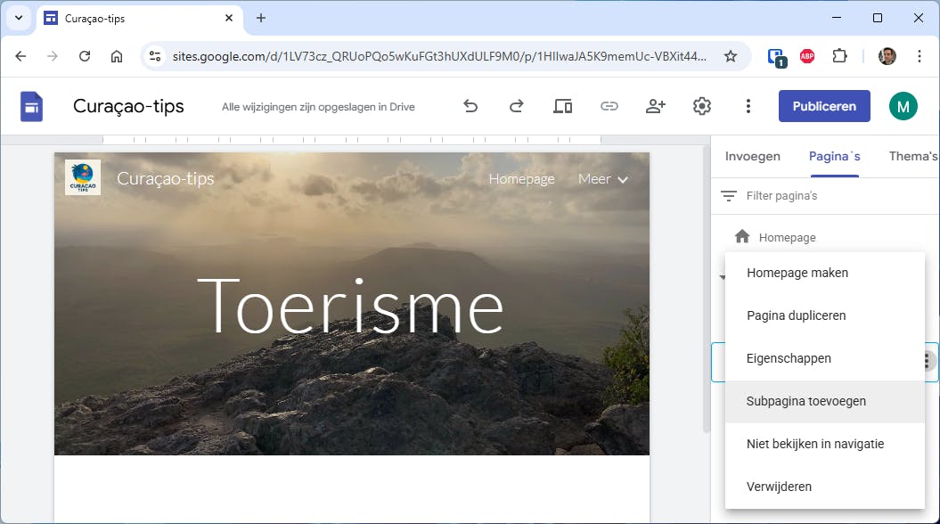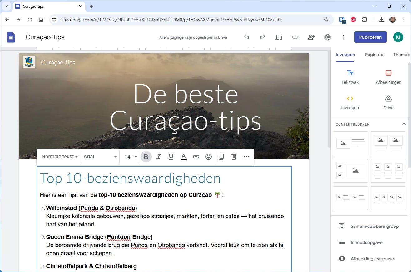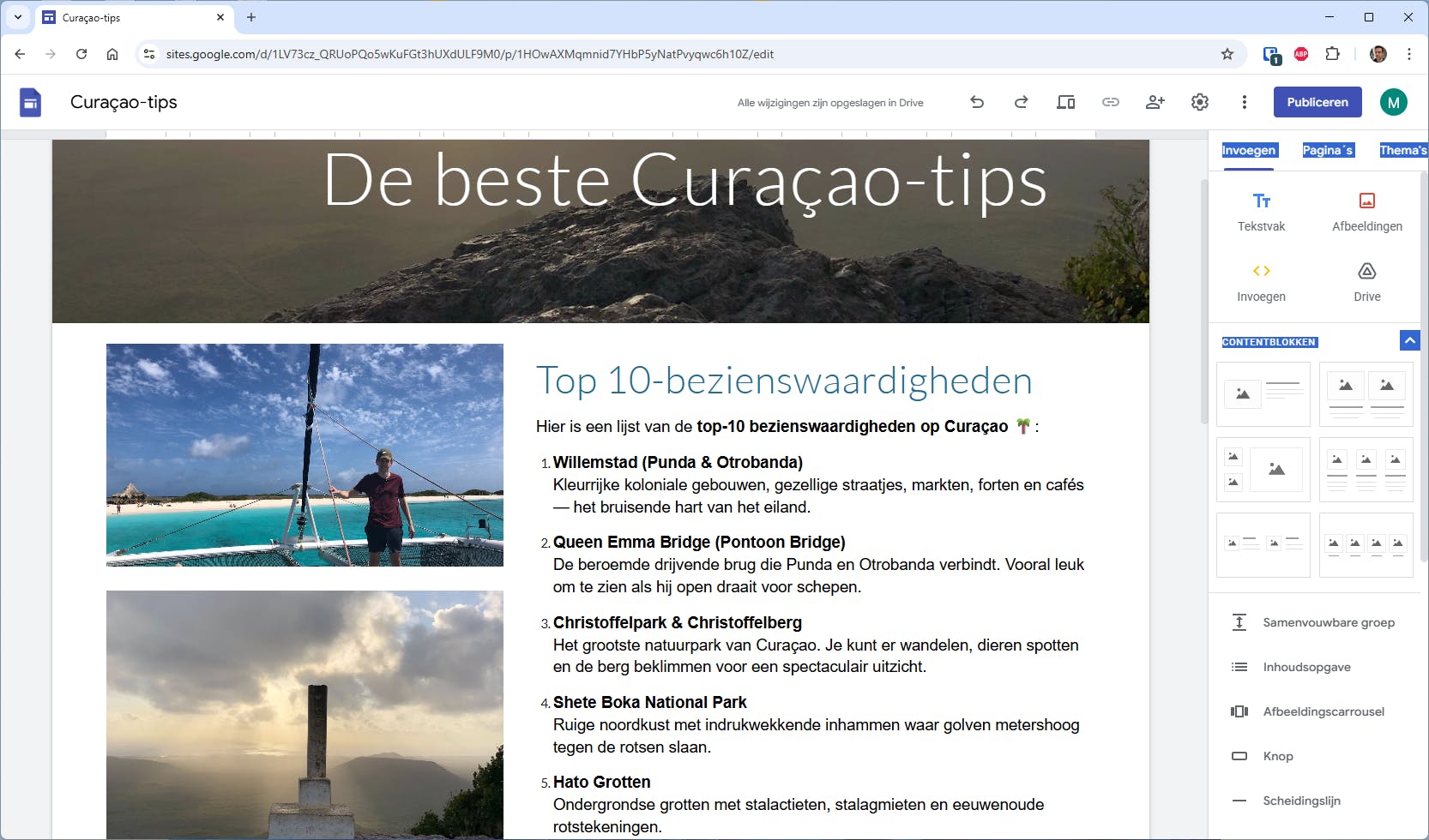 Ben je helemaal tevreden over jouw website? Hoog tijd om het openbaar te maken! Klik rechtsboven op de blauwe knop Publiceren. Het (gratis) domein begint altijd met https://sites.google.com/view/. Het einde van deze url kun je zelf verzinnen. In ons voorbeeld is de volledige link https://sites.google.com/view/curacao-tips.