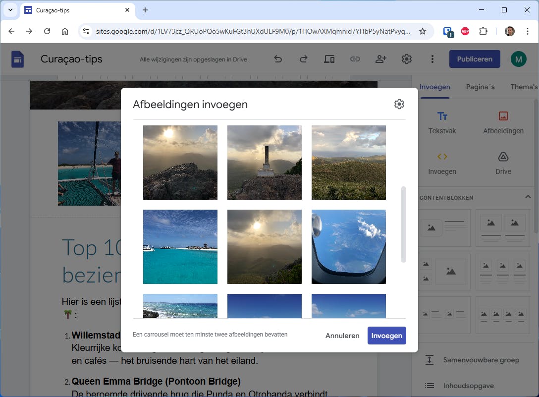 Wil je een heleboel foto’s laten zien? Wanneer je tientallen kiekjes aan een pagina toevoegt, wordt het al gauw een rommeltje. Google Sites bevat hiervoor een slimme oplossing. Creëer met een zogeheten afbeeldingscarrousel een soort diavoorstelling van jouw favoriete foto’s.