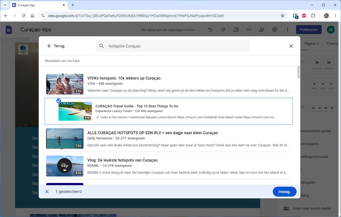 Ga naar het onderdeel Invoegen en kies YouTube. Mogelijk dien je hiervoor wel een eindje omlaag te scrollen. Je zoekt vanuit Google Sites rechtstreeks op YouTube. Typ één of meerdere trefwoorden en probeer interessant videomateriaal te vinden. Overigens plak je net zo makkelijk een link van een YouTube-video in het invoerveld. Klik op een geschikte video en bevestig rechtsonder met Invoegen.
