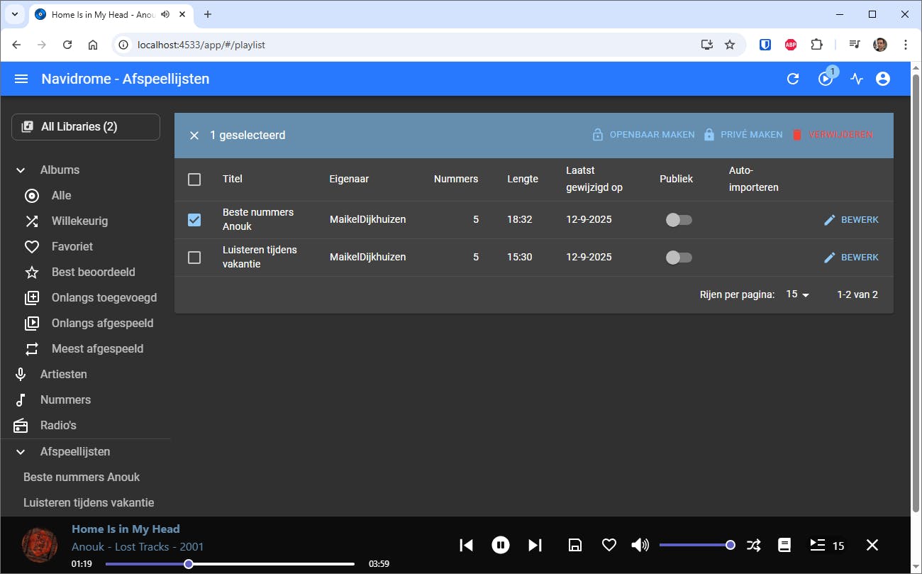 Zie je in Navidrome al een afspeellijst? Waarschijnlijk telt jouw digitale muziekcollectie dan één of meerdere m3u-bestanden. In zo’n tekstbestandje staan verwijzingen naar verschillende liedjes. Navidrome creëert hiervan op eigen houtje een afspeellijst. Wil je dat liever niet? Zweef in het linkermenu dan met de muisaanwijzer boven Afspeellijsten en klik op het tandwiel. Nadat je alle ongewenste afspeellijsten hebt aangevinkt, klik je op Verwijderen.