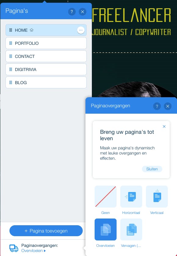Werken met sjablonen is waarschijnlijk de meest laagdrempelige manier om aan een eigen site te beginnen, maar natuurlijk wil je dat jouw project er anders uitziet dan de voorbeeld-ontwerpen. In de editor pas je het uiterlijk van je website aan tot in de details. Begin met de homepage. Daar kun je als achtergrond een kleur selecteren maar ook een foto of een video. Die laatste zijn sobere geanimeerde achtergronden. Ieder element laat zich trouwens verregaand aanpassen. Kies je bijvoorbeeld voor een video-achtergrond, dan kun je de afspeelsnelheid aanpassen, je kunt de video bedekken met een patroon of kleur en je kunt de animatie in een lus laten draaien. Wil je de gekozen wallpaper ook op de volgende webpagina’s plaatsen, dan klik je onderaan op de functie Toepassen op andere pagina’s.