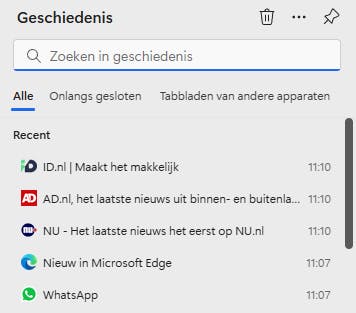 Is het al wat langer geleden dat je het tabblad hebt gesloten, dan kun je het terugvinden in de Geschiedenis. In dit overzicht zit een optie om recent gesloten tabbladen opnieuw te activeren. Klik bovenaan rechts op de drie puntjes. Klik op Geschiedenis. Je kunt ook de toetsencombinatie Ctrl+H gebruiken. De Geschiedenis is verdeeld in drie tabbladen. Standaard opent het met het tabblad Alle. Selecteer het tabblad Onlangs gesloten, dan krijg je de lijst van alle recente gesloten tabbladen te zien die je van hieruit alweer kunt openen.