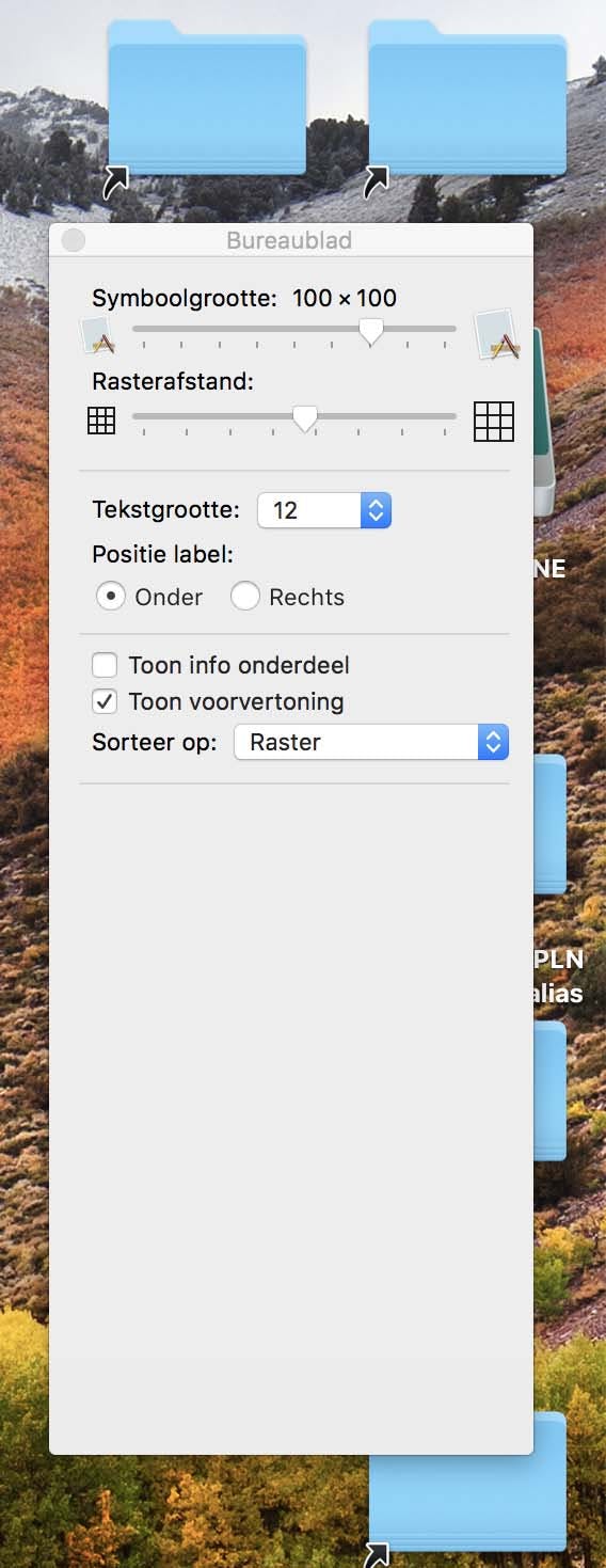 Standaard worden de bureaubladpictogrammen ook uitgelijnd op een (onzichtbaar) raster. De rastergrootte is in het aanpassingsvenstertje eveneens regelen middels de schuifregelaar onder Rasterafstand. Maak de afstanden zeker niet te klein, want dan ontstaat al heel snel een onoverzichtelijk geheel. Staan je pictogrammen ietwat chaotisch verdeeld over je bureaublad, dan klik je rechts (of weer die Control-klik) op een leeg stukje bureaublad. Kies in het geopende contextmenu op Ruim op en er ontstaat orde in chaos. Eventueel is het mogelijk om de pictogrammen ook op diverse criteria te sorteren. Klik daarvoor niet 'direct' op Ruim op, maar op een van de opties die je onder Ruim op één regel lager vindt.