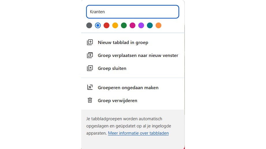 Er verschijnt een venstertje waarin je de groep een naam en kleur kunt geven. Kies een korte, herkenbare naam die het onderwerp van de groep weergeeft, zoals 'Werk', 'Recepten' of 'Vakantieplanning'. Een kleur toewijzen helpt je om snel onderscheid te maken tussen verschillende groepen. De groep verschijnt vervolgens als een gekleurde knop tussen je tabbladen. Een groot voordeel: als je op de groepsnaam klikt, worden de bijbehorende tabbladen ingeklapt, dat bespaart ruimte.