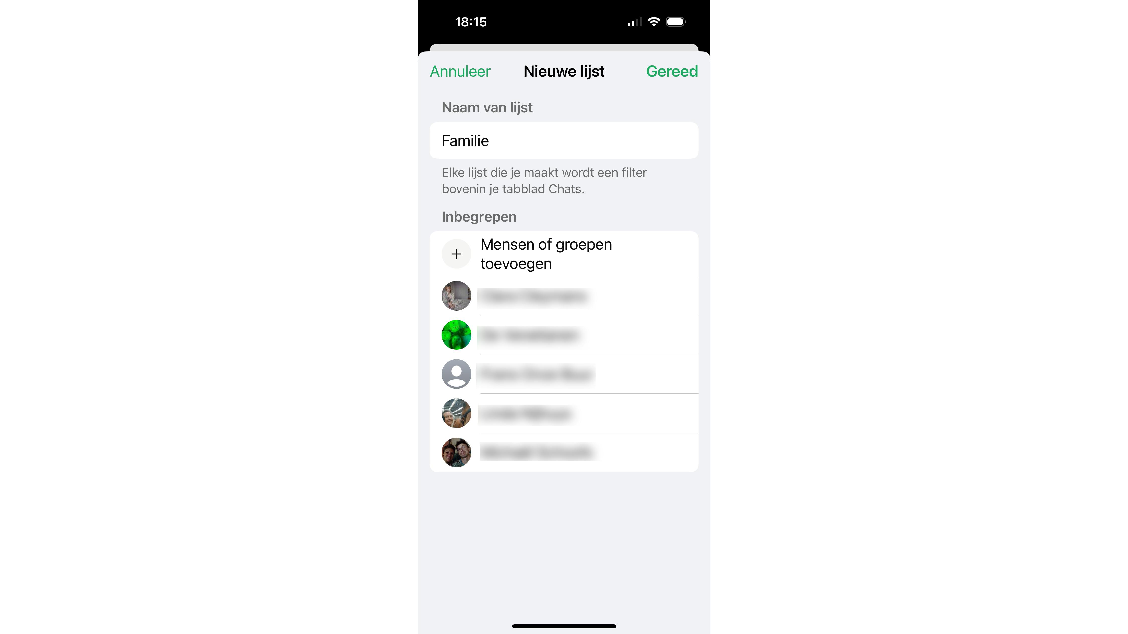 Je kunt ook zelf chatfilters toevoegen. Stel dat je snel alle chatgesprekken met alle familieleden wilt zien. Tik dan rechts naast de bestaande filters op het plusteken; je komt dan in het scherm Nieuwe lijst. Elke lijst die je samenstelt wordt een filter bovenaan in het tabblad Chats. Geef deze lijst een naam, bijvoorbeeld Familie, en tik op het plusteken in het vak Mensen of groepen toevoegen. Vervolgens krijg je eerst de lijst van de meest gebruikte chatcontacten te zien. Daaronder volgt de volledige lijst contacten, waar je de personen en groepen selecteert die je aan deze lijst wilt toevoegen. Ben je klaar, dan tik je op Voeg toe en dan op Gereed. De nieuwe lijst is klaar voor gebruik en vanaf nu zal het filter zichtbaar zijn.