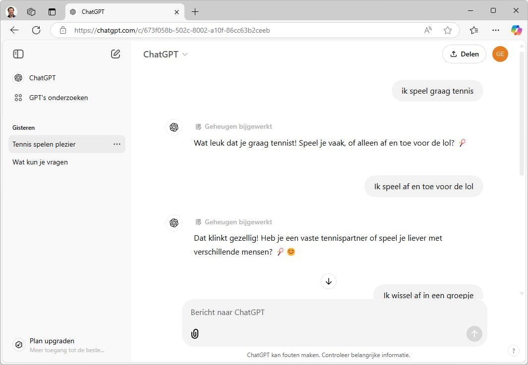 Tijdens het gebruik leert ChatGPT veel bij over jouw persoonlijke omstandigheden en voorkeuren, zoals je interesses, werk, hobby’s of gezinssituatie. Daarmee kan het antwoorden beter op jou afstemmen. Geef je bijvoorbeeld in een conversatie aan dat je geïnteresseerd bent in duurzaam ondernemen, dan zal het dit bewaren in het geheugen en in de conversatie een melding daarover geven. Soms stelt het nog aanvullende vragen ter verfijning.