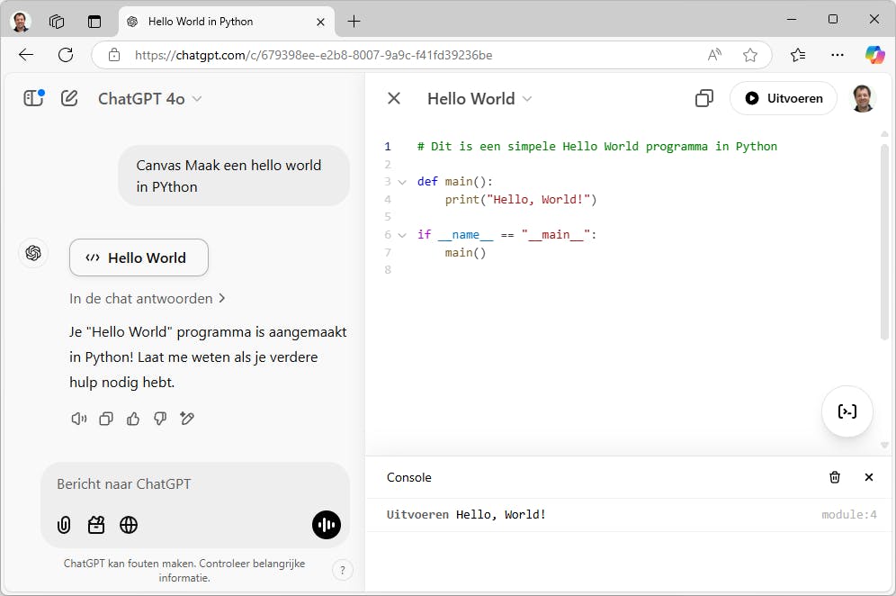 ChatGPT maakt bij veel taken zoals analyses zelf op de achtergrond gebruik van Python. En als je in een canvas de code voor een Python-programma hebt, dan zou je die code in principe direct kunnen laten uitvoeren, op de servers van ChatGPT. Daarvoor gebruik je de knop Uitvoeren rechtsboven. Er zijn echter wel beperkingen, opgelegd door de sandbox-omgeving waarin het programma wordt gedraaid.