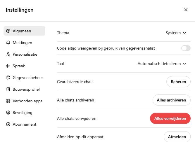 Verder zie je een handige optie voor een tijdelijke chat. Je kunt dit met de incognitomodus van je browser vergelijken. De conversatie komt dan niet in de conversatielijst en het geheugen wordt niet aangesproken. In het invoerveld voor je bericht zie je nog wat extra opties, zoals het bijvoegen van een bestand en tools als het genereren van een afbeelding, zoeken op internet en werken op een canvas. Maar je kunt ook gewoon direct vragen om bijvoorbeeld een canvas te gebruiken of een afbeelding te genereren. Verder zie je een optie om de spraakmodus te gebruiken. Veel van deze opties behandelen we verderop in dit artikel.