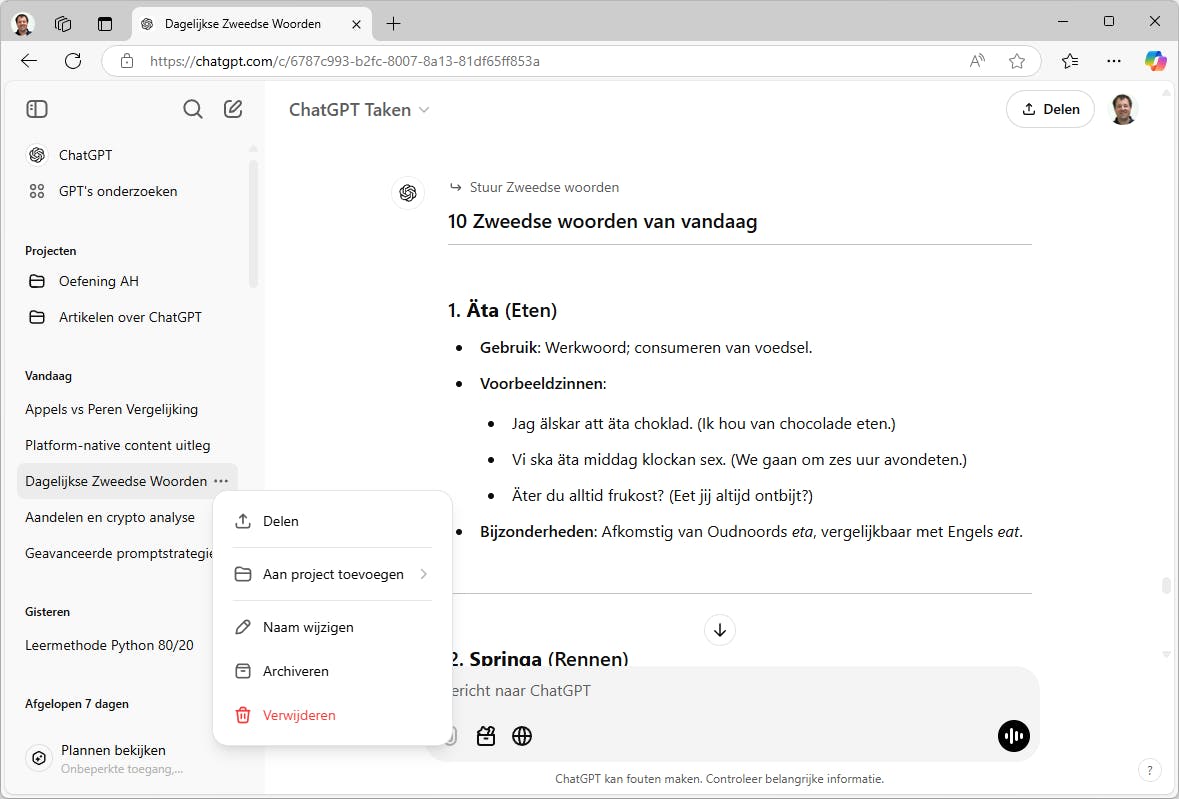 In de zijbalk zie je de conversatielijst met alle conversaties, die je individueel kunt archiveren of verwijderen. Eventueel kun je via de instellingen de gearchiveerde chats bekijken of in één keer alle conversaties archiveren of verwijderen. Heel praktisch is de zoekfunctie om eerdere conversaties sneller terug te vinden. Ook kun je een project maken, wat we in de volgende paragraaf behandelen. Je kunt een conversatie ook delen met anderen, in de huidige staat. De ontvanger kan het gesprek zien en vervolgen, maar ziet niet latere mutaties in jouw conversatie.