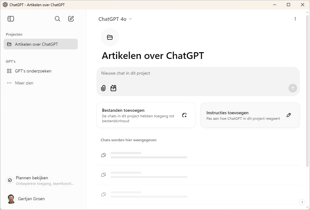Sinds kort kun je in ChatGPT met projecten werken. Je maakt zo’n project via het linkermenu. Het voordeel van een project is dat je conversaties daarover bij elkaar hebt. Ook kun je bestanden uploaden en aangepaste instructies instellen. De context van bestanden en gesprekken wordt naadloos gecombineerd in een project. Daarmee bedoelen we dat je in elke conversatie vragen kunt stellen over onderwerpen die in een bepaald document of een andere conversatie aan bod komen.