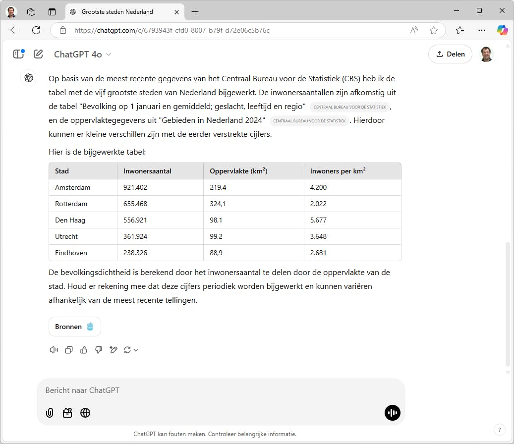 Dankzij de bronvermelding kun je de geraadpleegde artikelen nader onderzoeken. Volgens OpenAI zal dit de primaire manier worden waarop we informatie zoeken. Je hoeft niet altijd expliciet een zoekopdracht te starten. Ook als een conversatie daarom vraagt, kan ChatGPT recente(re) informatie op internet erbij zoeken.