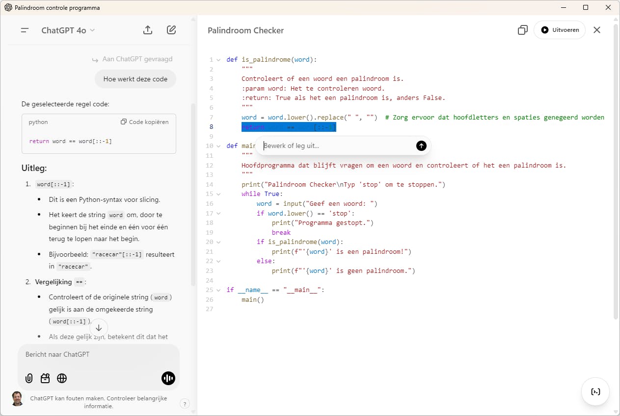 Via het deelvenster links kun je via prompts vragen om aanpassingen of uitleg, terwijl je rechts steeds de veranderingen ziet in de actuele tekst of code. Wat ook heel praktisch is, is dat je in het canvas een selectie kunt maken. Je kunt vervolgens vragen om bijvoorbeeld dat specifieke gedeelte uit te leggen of uit te breiden.