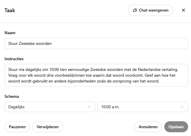 Je kunt in natuurlijke taal taken toevoegen die dan op de aangegeven tijd worden uitgevoerd. Ook herhalende taken zijn mogelijk. Vraag bijvoorbeeld om elke week het nieuws over ChatGPT samen te vatten. Of vraag om elke zondag zeven vegetarische recepten te ontvangen met een boodschappenlijst gegroepeerd per afdeling van de supermarkt. Ingestelde taken worden ook uitgevoerd als je offline bent. Je ontvangt een pushbericht of e-mailbericht als de taak is voltooid. Je kunt in eerste instantie maximaal tien taken instellen.
