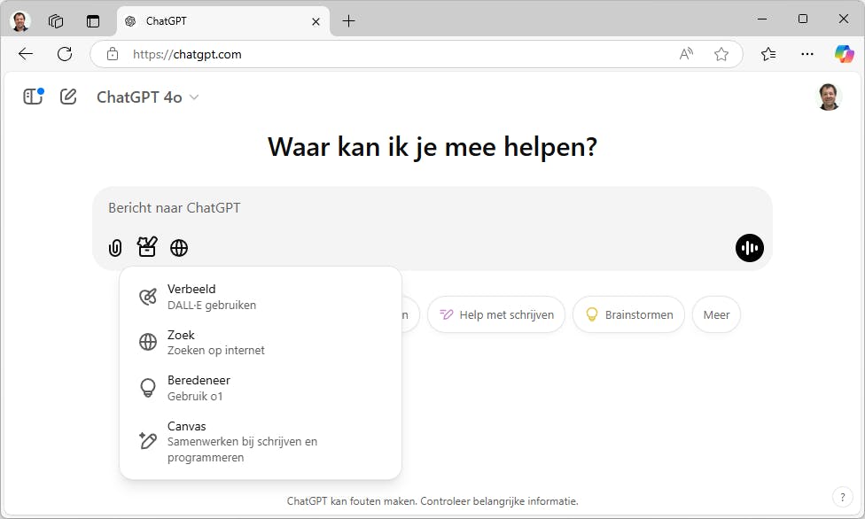 Als je ChatGPT opent, kun je via het invoerveld eenvoudig je conversatie starten. Er zijn een paar belangrijke details. Ten eerste kun je bovenaan eventueel een ander model kiezen. Vaak zul je GPT-4o gebruiken. Ook kun je de geavanceerdere modellen o1, o3-mini of o3-mini-high proberen voor complexe vragen of ingewikkelde programmeertaken.