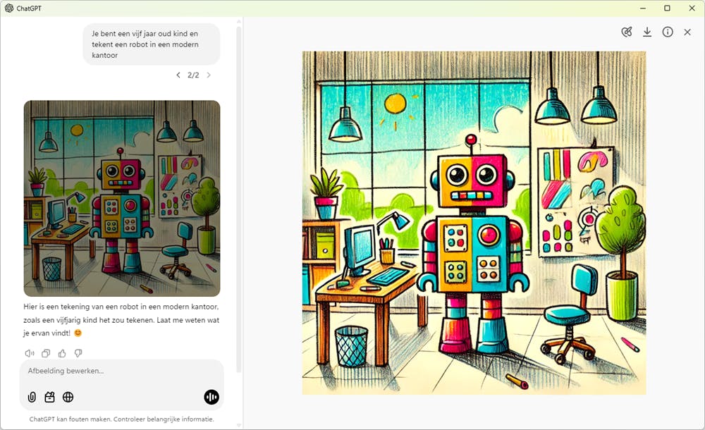 Probeer bijvoorbeeld eens een tekening door een vijf jaar oud kind, of een schilderij in de stijl van Van Gogh. Als omgeving kun je denken aan een futuristische stad, de savanne of een modern kantoor. Geef ook aan welke emotie of stemming het beeld moet uitstralen. Benoem eventueel het gewenste kleurenpalet, zoals warme herfstkleuren. Na het genereren van een afbeelding klik je erop om deze in het groot te zien. Je ziet dan ook de optie om het beeld te downloaden als webp-bestand.