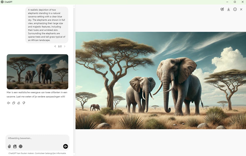 Er zijn een paar manieren om een afbeelding die je met ChatGPT hebt gegenereerd aan te passen. Open eerst de gegenereerde afbeelding in het groot door erop te klikken. Je ziet nu rechtsboven enkele pictogrammen. Een van deze pictogrammen geeft informatie over de prompt die ChatGPT heeft gebruikt om deze afbeelding te maken. Feitelijk is voor het genereren van de afbeelding niet onze eenvoudige instructie gebruikt, maar zijn juist heel veel details toegevoegd om het resultaat interessanter te maken.