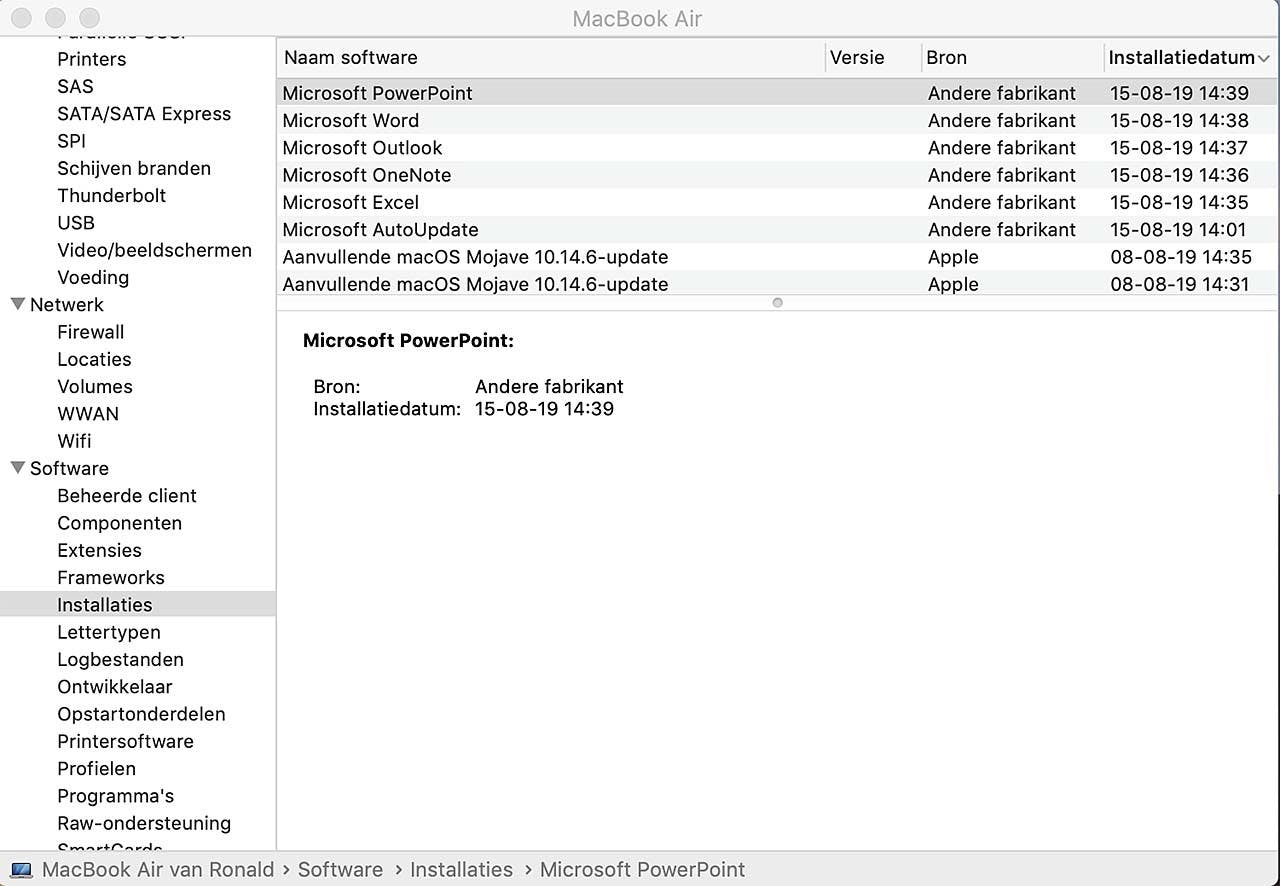 Je kunt de lijst nog verder finetunen door op de tekst Bron boven de daaronder staande kolom te klikken. Daarmee maak je een scheiding tussen software van derden en software van Apple zelf. Daarmee zie je snel bijvoorbeeld alle door Apple geïnstalleerde updates van het besturingssysteem en nog wat belendende zaken. Het is best praktisch om zo af en toe eens een blik op deze lijst te werpen. Zeker als er ook anderen met jouw computer werken (of er toegang toe hebben), zie je zo in één oogopslag of iemand (mogelijk ongewenste) software heeft geïnstalleerd en wanneer dat precies gebeurd is. Ook de update-historie van je besturingssysteem is zo netjes en overzichtelijk te bekijken. Praktisch is verder dat je nu ook updates ziet van programma's die dat normaal stilletjes op de achtergrond doen. En sommige programma's installeren ook ongemerkt nieuwe onderdelen en hulpprogramma's; Adobe is daar bijvoorbeeld erg goed in. Onder Installaties vind je alles terug!