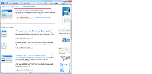 TeamViewer is er in verschillende smaken. U installeert of gebruikt de versie die het beste overeenkomt met uw wensen. De verschillende versies zijn te vinden op TeamViewer onder Download. De programma's zijn gesorteerd op besturingssysteem. TeamViewer All-In-One is het meest compleet. Hiermee kunt u zowel een scherm overnemen als laten overnemen. Als u iemand op afstand helpt, is de volledige versie soms teveel van het goede. U hebt dan TeamViewer All-In-One nodig, maar diegene die u aan het helpen bent, kan volstaan met TeamViewer Quicksupport voor de spontane klant. Deze versie behoeft geen installatie maar kan direct worden gestart. Als u uw eigen computer of een server op afstand wilt benaderen, is TeamViewer Host de beste keuze.