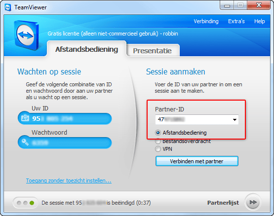 Als u iemand op afstand wilt helpen, bestaat de basis uit het overnemen van het toetsenbord, muis en beeldscherm. Uw partner kan meekijken en hier iets van opsteken. Uw partner heeft slechts één ding nodig: TeamViewer Quicksupport. Laat dit downloaden en starten (installatie is overbodig) en vraag om de ID-code en het wachtwoord. Aan uw kant installeert u de volledige TeamViewer-versie. U geeft de ID-code op bij Partner-ID, klikt op Verbinden met partner en geeft het bijbehorende wachtwoord op. De verbinding wordt tot stand gebracht en u hebt volledige controle. Het is mogelijk dat de beveiligingssoftware van uw computer (of die van uw partner) alarm slaat omdat een programma verbinding probeert te maken met internet. Keur deze actie goed, anders werkt TeamViewer niet.