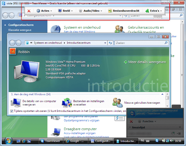 U kunt de muis en het toetsenbord gebruiken op het beeldscherm van uw partner alsof u achter uw eigen computer werkt. TeamViewer optimaliseert het beeld van uw partner op snelheid. Hierdoor verdwijnt bijvoorbeeld de bureaubladachtergrond. Het scherm van uw partner draait in een Windows-venster dat u kunt verkleinen of vergroten. De weergave van uw partner-scherm schaalt automatisch mee. Boven in beeld kunt u via de TeamViewer-werkbalk instellingen omtrent de verbinding aanpassen. Onder de knop Acties vindt u speciale functies, zoals het sturen van een Ctrl+Alt+Del-opdracht of op afstand herstarten. U kunt zelfs een audioverbinding opstarten, maar in de praktijk zal een telefonische spraaklijn prettiger werken.