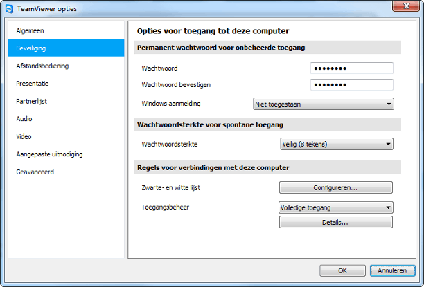 De veiligheid van TeamViewer is goed geregeld, zeker als we dit vergelijken met sommige concurrenten. TeamViewer werkt zonder handmatige (en dus foutgevoelige) routerinstellingen. De sessie wordt beveiligd met 256 bit AES-encryptie. Meer details hierover vindt u op TeamViewer onder Support / Technical questions. Voor wie het nodig vindt kan de beveiliging nog een tandje aanscherpen in TeamViewer-instellingen via Extra / Opties / Beveiliging. Hier kunt u een zwart (en/of witte) lijst aanleggen van partner-ID's die verbinding mogen maken, zeer geschikt als u TeamViewer gaat gebruiken om uw eigen pc over te nemen met uw eigen notebook. Met Toegang beheer kunt u aangeven dat bijvoorbeeld het overnemen van het scherm alleen mogelijk is na een bevestiging. Deze instelling is er ook voor de VPN-verbinding en bestandsoverdracht. Een ander punt dat ook met beveiliging te maken heeft zijn dreigementen van sommige antivirusprogramma's. Omdat TeamViewer beheer op afstand mogelijk maakt, denken sommige beveiligingsprogramma's dat er 'iets' mis gaat en geven een nodeloze waarschuwing.