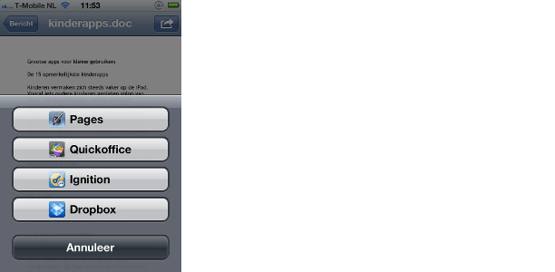 indeling die ook prima kan worden gebruikt op de Mac. Toch zullen de meeste mensen bestanden van de doc- of docx-indeling blijven gebruiken, omdat Word uit het Microsoft Office-pakket voorlopig nog met afstand het meest gebruikte tekstverwerkingsprogramma is. Gelukkig kunt u ook Word-bestanden eenvoudig openen in Pages. Daarbij zult u echter wel tegen het probleem aanlopen dat de inhoud van een Word-document af en toe niet helemaal correct wordt getoond. Niet alle functies van Word worden namelijk ondersteund door deze app. Daarom is het altijd een goed idee om een Word-bestand niet te complex te maken. Er zijn uitgebreidere pakketten beschikbaar waarmee de kans groter is dat uw Word-bestanden worden getoond zoals oorspronkelijk bedoeld, al moet u nooit verwachten dat dit in alle gevallen helemaal goed gaat. De bekendste apps waarmee u deze taken kunt uitvoeren zijn Quickoffice Pro en Documents To Go. Beide apps bestaan uit volledig mobiele Office-applicaties waarmee bijvoorbeeld zakelijke gebruikers veel functionaliteit aan de iPhone toevoegen. Goedkoop zijn deze apps overigens niet. Voor Quickoffice Pro moet u in de App Store 12 euro neerleggen, terwijl Documents To Go 8 euro kost.