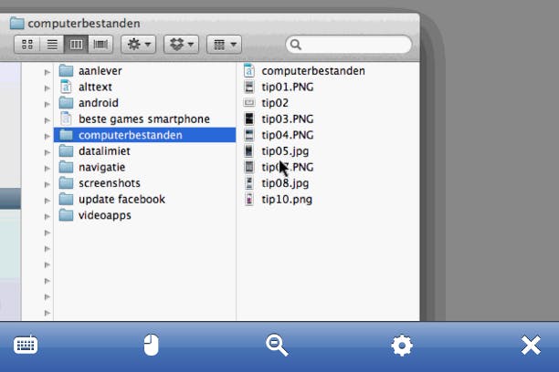 Er is nóg een manier om al uw computerbestanden op een smartphone te gebruiken. Hiervoor laat u de bestanden gewoon waar ze zijn en gebruikt u uw telefoon slechts als 'dumb terminal' voor uw computer. Bij deze manier van werken wordt gesproken over 'Remote Desktop'. U gebruikt uw smartphone daarbij om de muis te besturen terwijl uw computer op een andere locatie aan staat. De bekendste app waarmee u dit bewerkstelligt, is Logmein. Er is inmiddels al een gratis variant van de app verschenen voor de iPhone, maar voor de Android-versie moet u nog steeds meer dan 20 euro neerleggen. Nadat u de clientsoftware op uw pc of Mac hebt geïnstalleerd, kunt u door de app op te starten gewoon aan het werk via uw smartphonescherm. U kunt dus Word of Excel opstarten en in deze programma's werken. Wel moet daarbij worden vermeld dat het, ondanks de handige besturing en de praktische snelkoppelingen, lastig is om langer dan tien minuten op deze manier te werken. Voor simpele bewerkingen is Remote Desktop vanaf uw smartphone echter een prima systeem. De app Teamviewer (zowel voor de iPhone als voor Android-toestellen gratis beschikbaar) biedt vergelijkbare functionaliteit.