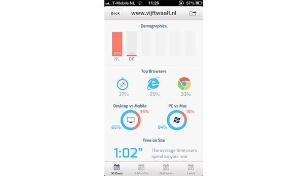 Deze app toont gegevens uit Google Analytics. Dat doen wel meer apps, maar deze app doet het zo fraai dat je het idee hebt dat je naar een infographic kijkt. Vooral als je bijvoorbeeld bekijkt hoeveel sitebezoekers een pc gebruiken en hoeveel een mobiele telefoon. Het allerfijnste: het is niet alleen fijn om naar te kijken, maar je snapt ook daadwerkelijk beter wat de cijfers precies betekenen.