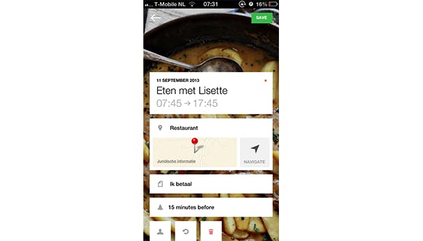 De agenda-items kunnen worden voorzien van notities, locaties, genodigden enzovoort. De afspraken kunnen overigens ook automatisch in de app Agenda worden ingevoegd, handig voor synchronisatie. Extra mooi zijn de foto's die achter elk item worden getoond.
