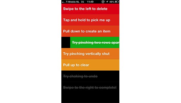 Een app die hetzelfde effect op ons heeft als Weathercube, maar dan is dit een takenlijst. De felle kleuren zijn even wennen, maar daar kijk je snel doorheen als je ziet hoe heerlijk eenvoudig het is om met een veegbeweging taken toe te voegen, te verwijderen enzovoort, om vervolgens met een knijpbeweging taken samen te voegen tot een lijst, of andersom een lijst open te klappen. Het is echt op fantastische wijze ontworpen en briljant in z'n eenvoud.