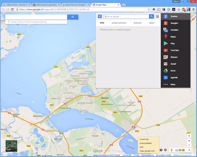De kans is vrij groot dat je meerdere diensten van Google gebruikt. Immers, Gmail, de zoekmachine van Google, Google Translate, Maps, YouTube: dat zijn allemaal producten van hetzelfde bedrijf. Maar wat als je al die diensten gebruikt, moet je dan allemaal bladwijzers aanmaken? Dat kan, maar dat hoeft niet. Met Black Menu verschijnt er met één druk op de knop een zwarte balk aan de zijkant van je browser (die je in kunt klappen of open kunt laten staan) met daarin alle diensten van Google netjes op een rij. Gebruik je alleen Gmail dan heb je hier niets aan, maar gebruik je méér diensten van Google, dan scheelt dit je enorm veel tijd.