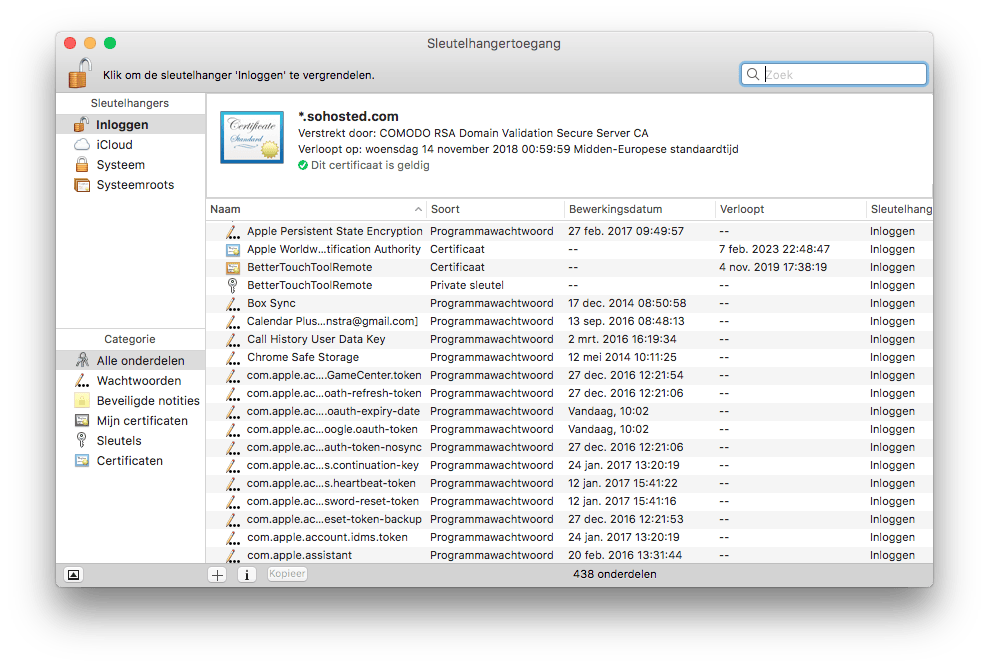 Links zie je al je sleutelhangers, standaard is Inloggen geselecteerd. Je kunt de lijst rechts ook sorteren op onderdeel, klik op Certificaten om al je certificaten in te zien. Dit zijn bestanden die websites naar je systeem kopiëren zodat je browser een beveiligde verbinding tot stand kan brengen.