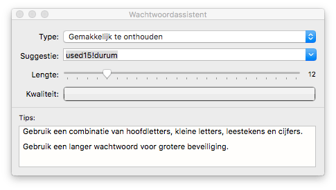 Wil je dat je Mac een wachtwoord voorstelt, klik dan op het sleuteltje rechts. Een nieuw venster wordt geopend waar je aan kunt geven hoe je wachtwoord eruit moet zien. Achter Type geef je bijvoorbeeld aan of je alleen letters en cijfers wilt gebruiken en achter Lengte geef je aan hoeveel karakters je wachtwoord moet hebben.