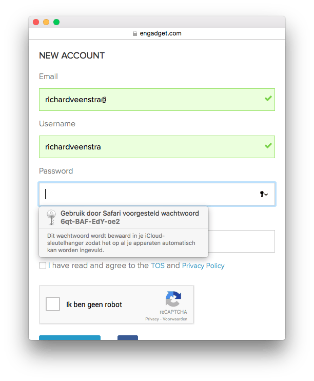 Als je je bij een nieuwe dienst aanmeldt, dan zal Safari je automatisch een wachtwoord aanbieden. Dit is een combinatie van kleine en grote letters en cijfers en streepjes.
