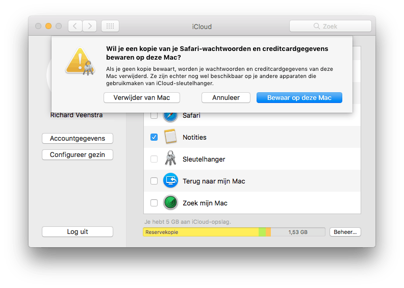 Wil je deze functie voor een bepaalde Mac uitschakelen, haal dan het vinkje weg en bevestig de actie in het venster door op Bewaar op deze Mac te klikken. Nu worden je wachtwoorden en creditcardgegevens op je Mac bewaard. Wil je al deze data verwijderen, kies dan voor Verwijder van Mac.