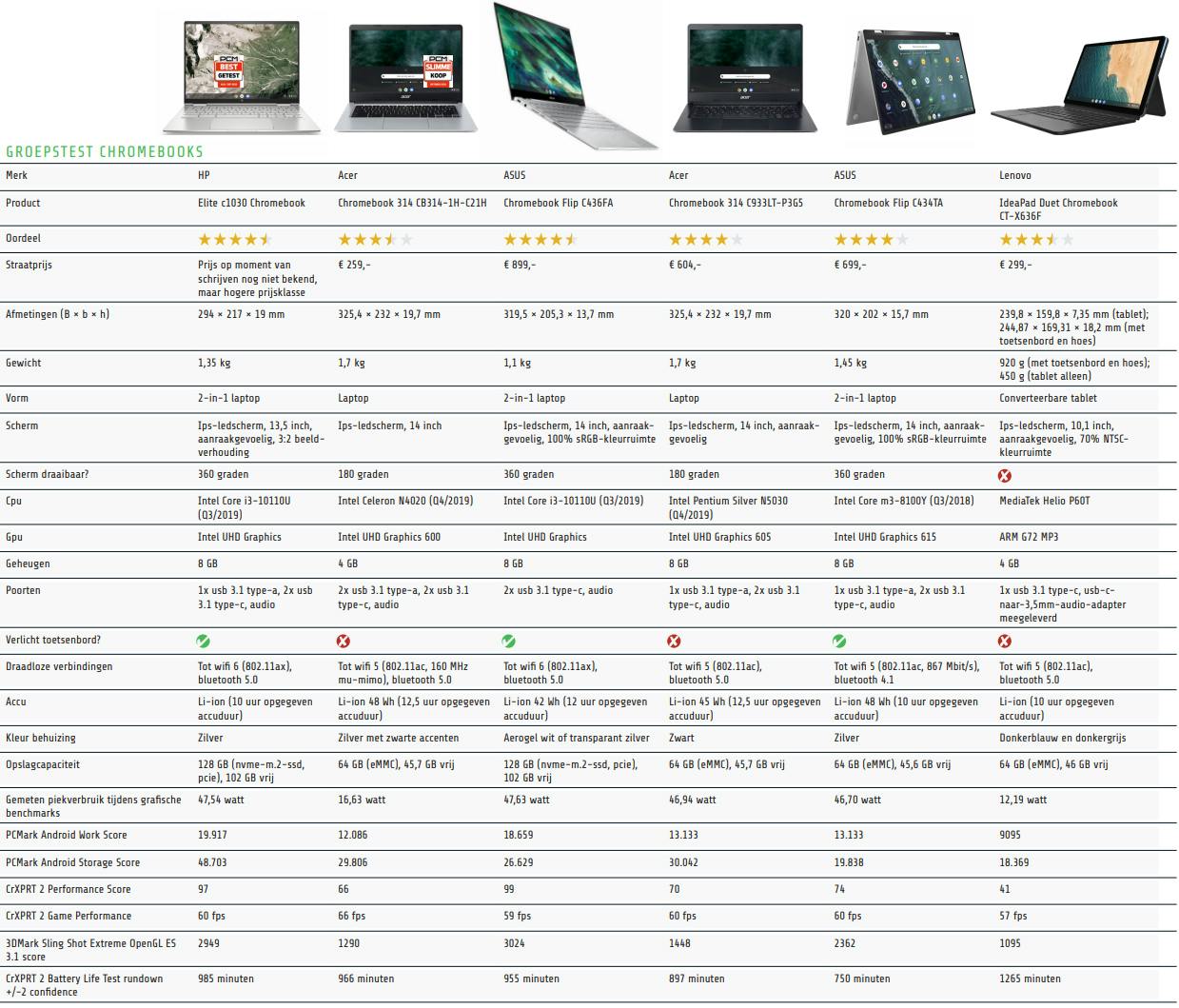 Houd er rekening mee dat Chromebooks meestal leverbaar zijn met verschillende uitrustingsniveaus, waarvan wij er maar één kunnen testen. Heb je naar aanleiding van deze reviews een bepaald model op het oog, check dan altijd even welke opties er voor je open liggen. Meer werkgeheugen en opslag, bijvoorbeeld. Dat kost uiteraard dan wel meer.