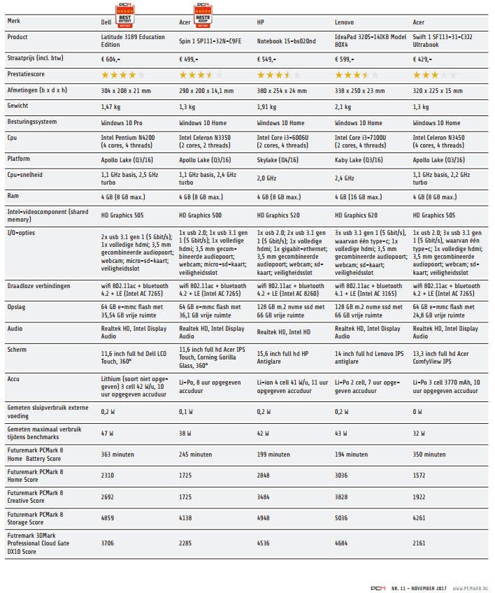 De basismodellen sturen ze minder graag in voor een test. Toch slaagde PCM erin om vijf starterlaptops van vier merken te testen. Naast het maximale prijskaartje van 600 euro, moesten deze Windows 10-laptops voldoende krachtig zijn om er vlot school- en kantoorsoftware op te draaien.