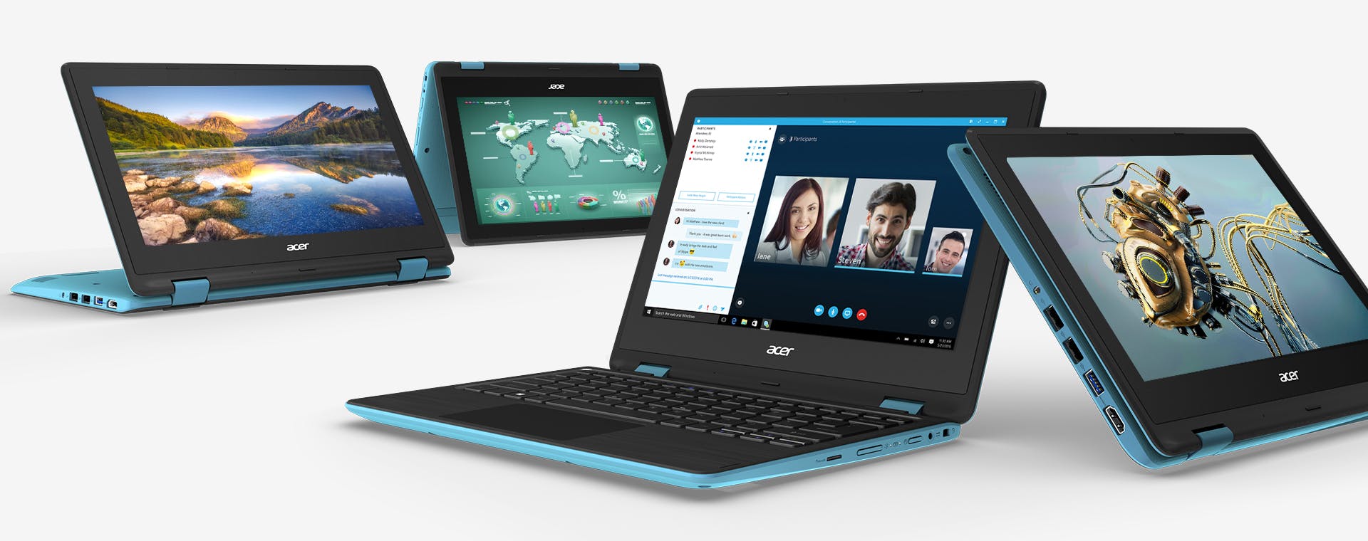 De Acer Spin 1 is een convertibele laptop met vier gebruiksstanden: laptop, tent, stand en tablet. Windows 10 detecteert zelf wanneer je de desktopmodus verlaat en schakelt zichzelf dan al dan niet automatisch om in de tabletmodus. Het 11,6inch-aanraakscherm draait 360° over twee stevige metalen scharnieren. Acer verkoopt er verschillende modellen van, die naar keuze voorzien zijn van Intel Pentium- of Celeron-processoren, 4 GB ram en e-MMC of ssd-opslag. In dezelfde reeks heeft het merk ook duurdere, krachtige convertibele laptops van de Spin 3-, 5- en 7-reeksen.