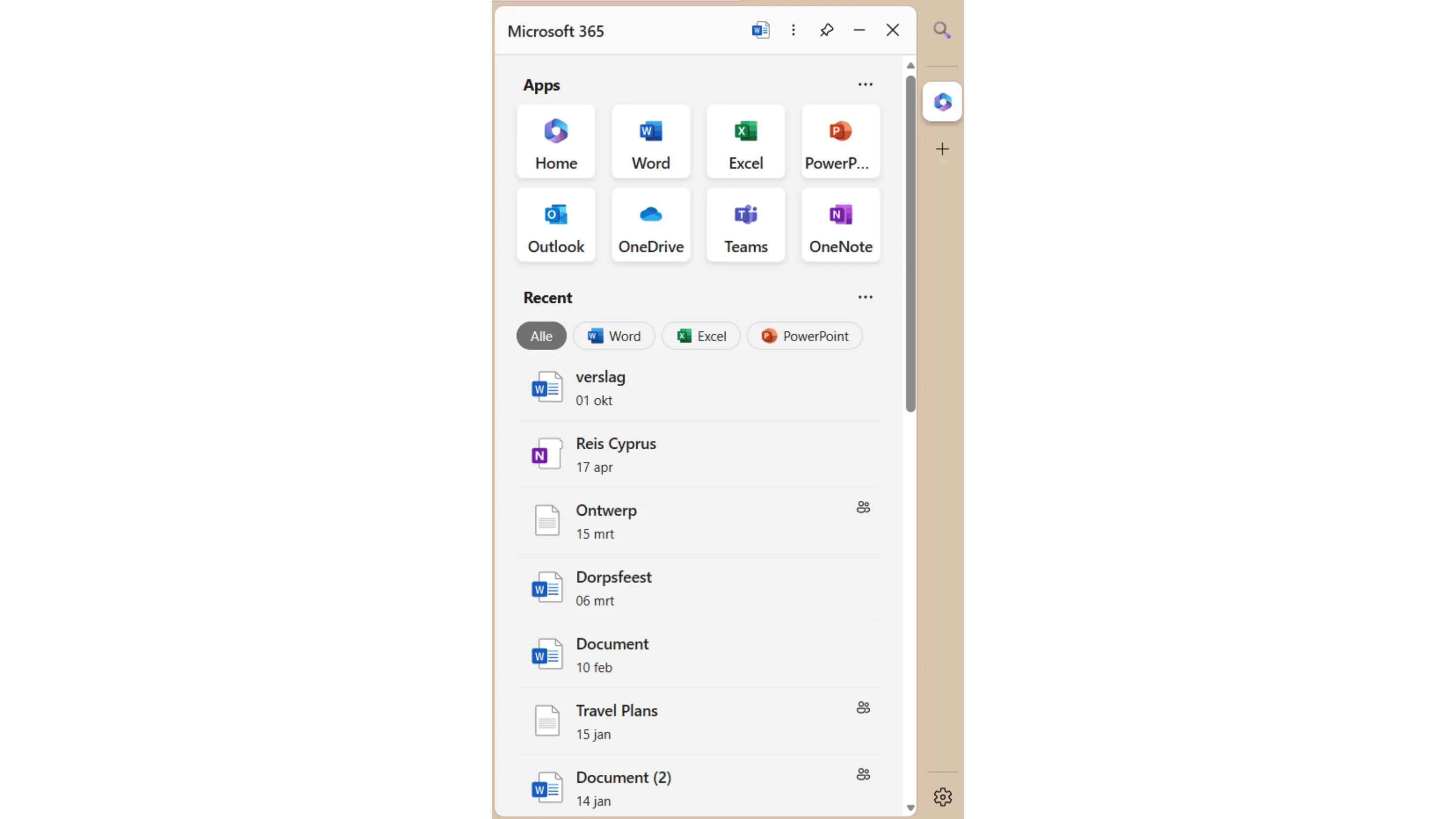 Dankzij de zijbalk kun je Edge gebruiken als toegangspunt tot de Microsoft 365 Office-suite. Selecteer onder Meer ontdekken de categorie By Microsoft en klik op het zeshoekige, veelkleurige Microsoft 365-pictogram. Hierdoor verschijnen niet alleen de Microsoft 365-apps zoals Word, Excel, PowerPoint, OneNote, Teams, Outlook en OneDrive, maar ook de recente bestanden die je in deze apps hebt bewerkt. Je kunt de lijst met bestanden filteren op basis van de app. Wil je bijvoorbeeld alleen de recente Excel-bestanden zien, klik dan op de knop Excel onder het kopje Recent.