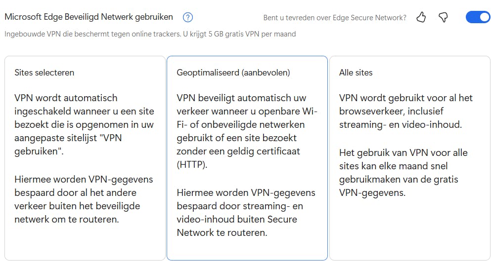 Microsoft Edge heeft een ingebouwde beveiligingsfunctie. Edge Secure Network werkt als een lichte, geïntegreerde VPN. De browser versleutelt hierdoor het internetverkeer, waardoor websites en tussenliggende partijen zoals providers minder goed kunnen zien wat je doet. Dat is vooral interessant op openbare wifi-netwerken. Edge Secure Network beschermt je verbinding en verbergt je ip-adres, maar het blijft beperkter dan een volwaardige VPN. Je kunt bijvoorbeeld geen ander land of regio kiezen en er geldt een maandelijkse limiet (gratis 5 GB per maand) op het dataverbruik. De functie inschakelen is eenvoudig. Ga via de drie puntjes naar Instellingen / Privacy, zoeken en services / Beveiliging en zet de schakelaar bij Microsoft Edge Beveiligd Netwerk gebruiken aan. Vanaf dat moment verschijnt er in de knoppenbalk een pictogram van een schild dat aangeeft dat de beveiligde verbinding actief is. Zo krijg je, zonder extra software te installeren, een extra laag bescherming tijdens het browsen.