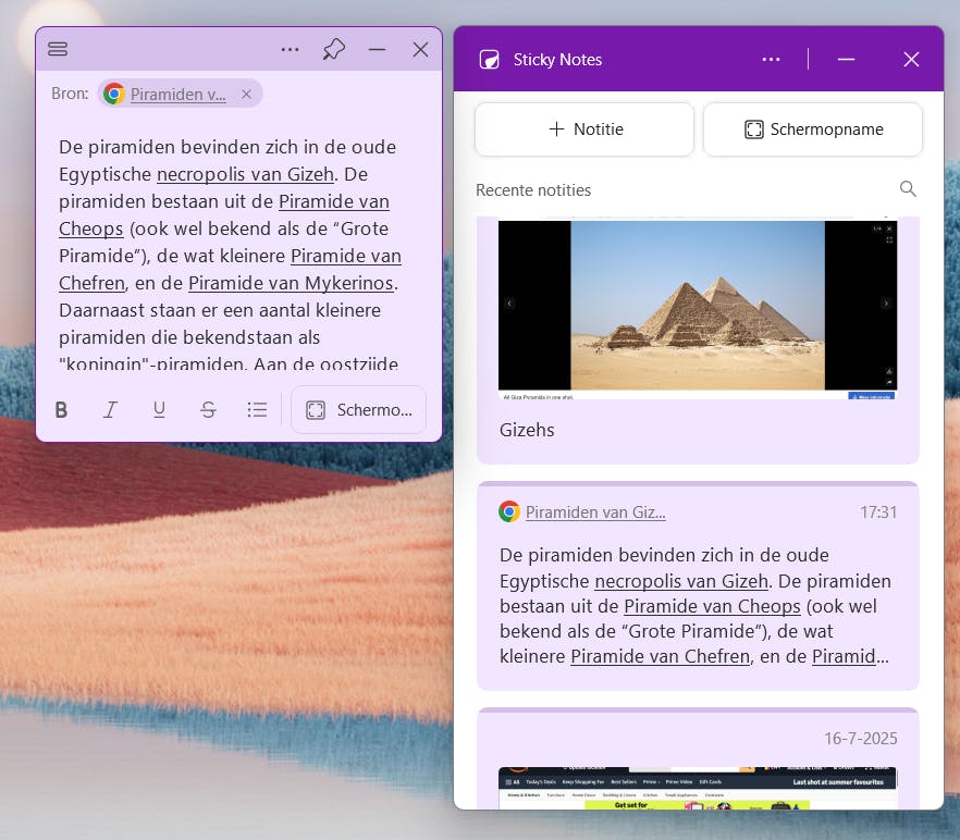 Door met de camera van je smartphone de QR-code in Sticky Notes te scannen, openen je notities meteen in de mobiele OneNote-app. De app is verdeeld in twee tabbladen. In het eerste tabblad maak en beheer je de notities. Het tweede tabblad is bedoeld voor schermafdrukken die je hiermee maakt van actieve vensters. Staat er tekst in zo’n afbeelding? Dan herkent Sticky Notes die automatisch via OCR en kopieert de tekst naar het klembord, zodat je hem direct in een andere toepassing kunt plakken.Nog een slimme toevoeging: Sticky Notes bewaart automatisch de bron van geplakte inhoud. Kopieer je iets van een webpagina, dan wordt de link vanzelf mee opgeslagen. Zo open je later automatisch de bron van de informatie opnieuw vanuit zo’n roze, geel of blauw kattenbelletje.