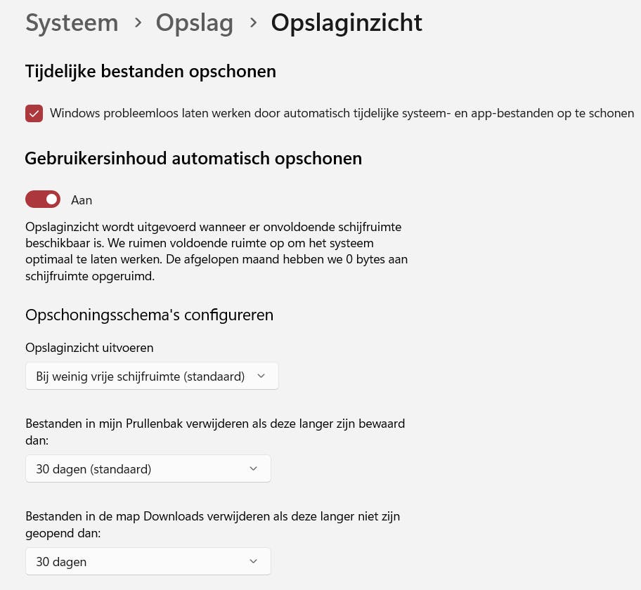 Opslaginzicht kan automatisch schijfruimte vrijmaken wanneer dat nodig is. Veel gebruikers kennen deze functie niet of hebben hem uitgeschakeld, terwijl het een eenvoudige manier is om opslagproblemen te voorkomen. Je vindt de functie via Instellingen / Systeem / Opslag. Zet de schakelaar bij Gebruikersinhoud automatisch opschonen aan en Windows verwijdert bestanden uit de Prullenbak die er langer dan dertig dagen staan. Je kunt dit verfijnen en instellen op dagelijks, om de veertien dagen of om de zestig dagen.