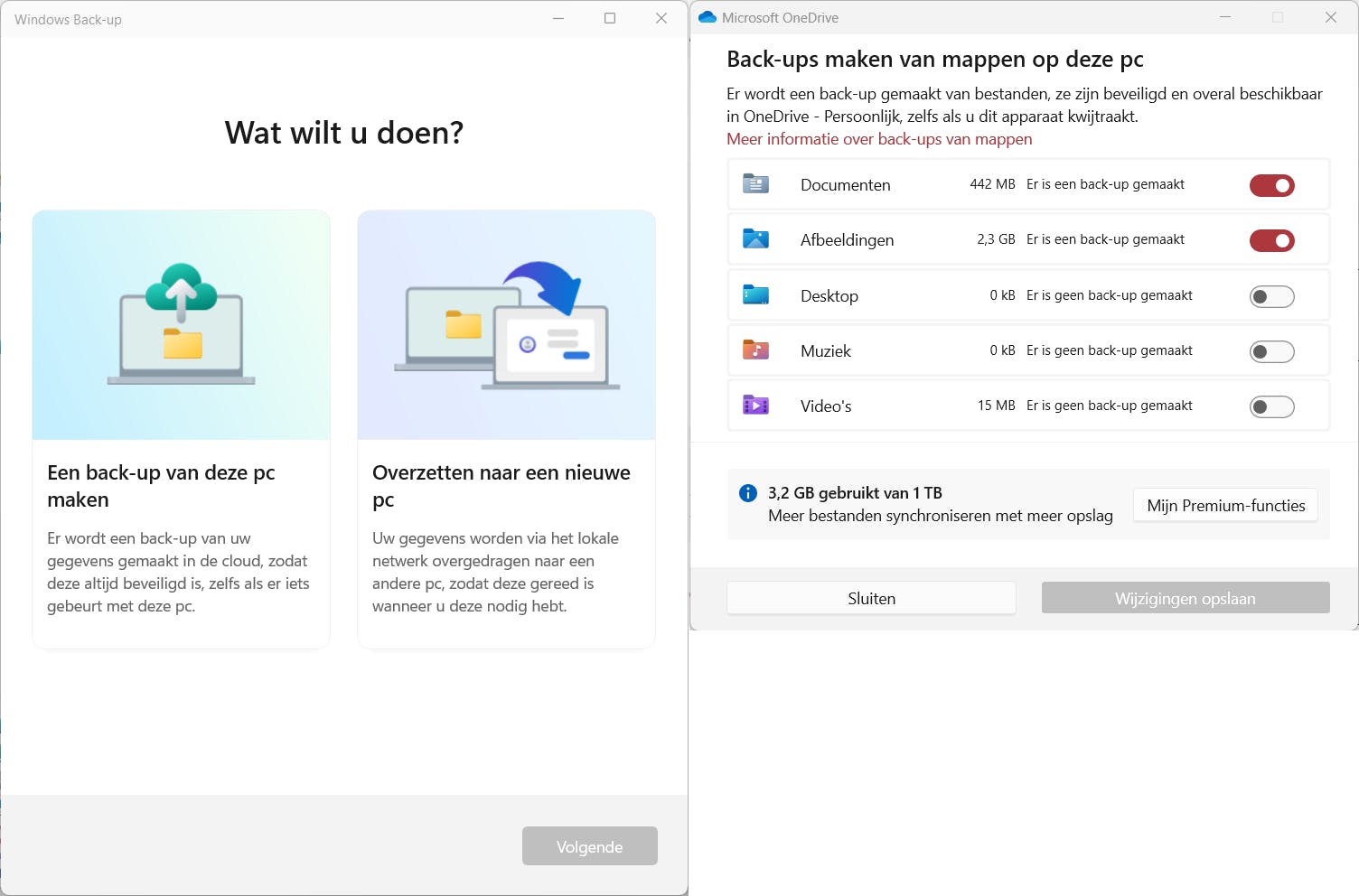 Voor je bestanden vertrouwt Windows Back-up op OneDrive. Via de OneDrive-app kun je onder het tandwieltje instellen dat de mappen Documenten, Afbeeldingen en Bureaublad automatisch naar de cloud worden gesynchroniseerd. Andere mappen voeg je eenvoudig toe door ze in je OneDrive-map te plaatsen. Voor een goede OneDrive-back-up moet je dus én de moderne Windows Back-up activeren, én in OneDrive aanduiden welke mappen automatisch worden gesynchroniseerd.