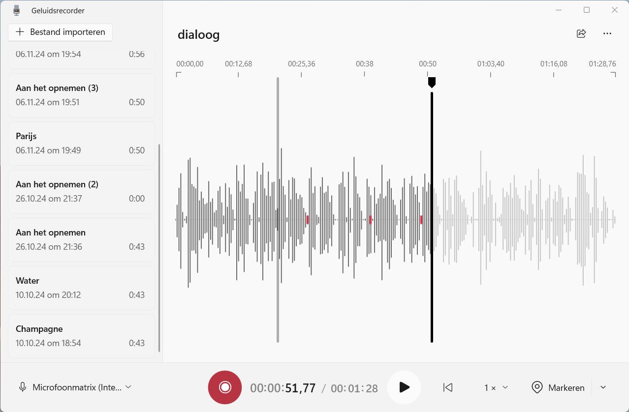 Handig zijn de markers die je tijdens of na de opname plaatst. Ze onderbreken de opname niet, maar maken het wel eenvoudig om achteraf direct naar specifieke punten te navigeren. Geluidsrecorder van Windows 11 gebruik je om opnames te maken en af te spelen, maar je kunt geen fragmenten knippen of wegsnijden.
