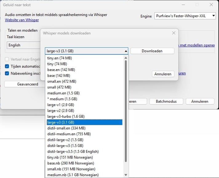 Bij Whisper klik je op de knop met drie puntjes en kies je het gewenste model. Groter betekent doorgaans accurater, maar ook zwaarder en trager. Modellen met .en ondersteunen enkel Engels. Voor andere talen kies je bijvoorbeeld medium (1,5GB) of large-v3 (3,5GB), afhankelijk van de videolengte en de kracht van je pc (RAM, cpu en gpu). Bevestig met Downloaden. Selecteer vervolgens de audiotaal bij Taal kiezen. Dit wordt ook de ondertitelingstaal, tenzij je Vertaal naar Engels activeert. Laat de overige opties ingeschakeld. Bij Geavanceerd kun je met talrijke parameters bijsturen, maar we hebben niet de ruimte hier verder op in te gaan. Start het proces met Genereren (of via Batchmodus voor meerdere video's tegelijk). De duurtijd hangt onder meer af van de hoeveelheid gesproken audio.