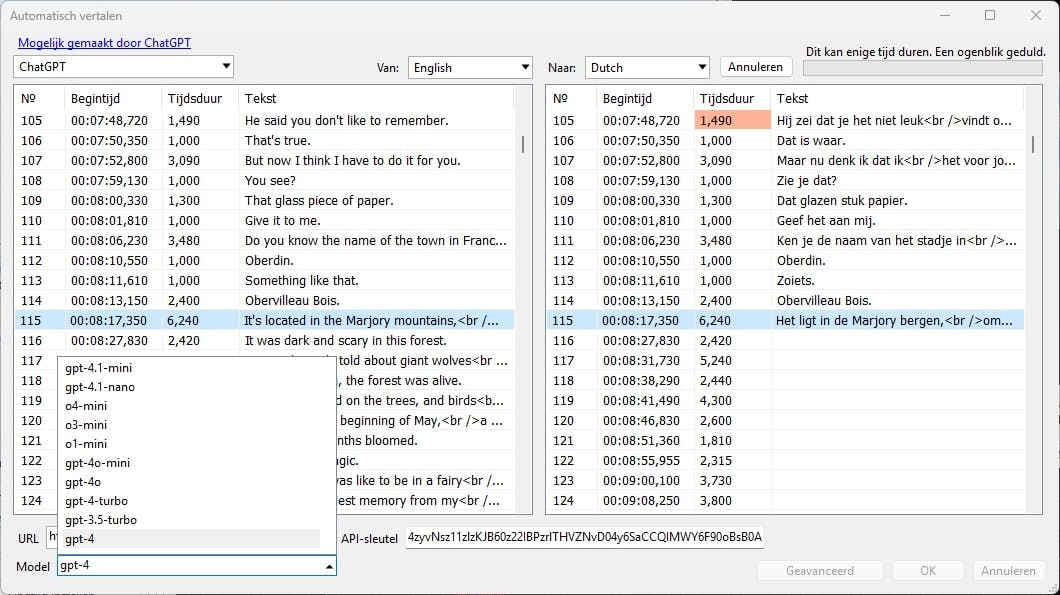 Ga naar platform.openai.com/api-keys, meld je aan met je account en klik op + Create new secret key. Geef een naam op en bevestig met Create secret key. Kopieer de sleutel met Copy. Open in Subtitle Edit Vertalen / Automatisch vertalen, kies ChatGPT in het uitklapmenu en plak de sleutel met Ctrl+V bij API-sleutel. Selecteer het gewenste model, zoals gpt-4, en stel de bron- en doeltaal in. Via Geavanceerd kun je eventueel extra instructies meegeven. Klik op Vertalen om het vertaalproces te starten.
