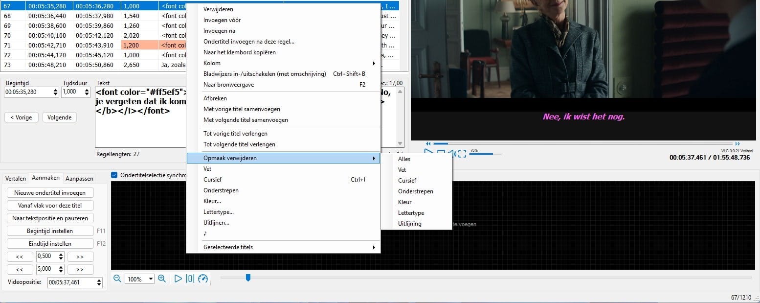 De belangrijkste vormgevingsfuncties zie je wanneer je in Subtitle Edit met rechts klikt op een of meer geselecteerde ondertitels. In het snelmenu vind je opties als Vet, Cursief, Onderstrepen, Kleur, Lettertype en Uitlijnen. Deze opmaak verschijnt als html-tags in de ondertitels en is zichtbaar in de voorbeeldweergave en in videospelers die dit ondersteunen. Via Opmaak verwijderen kun je specifieke opmaakelementen weer weghalen.